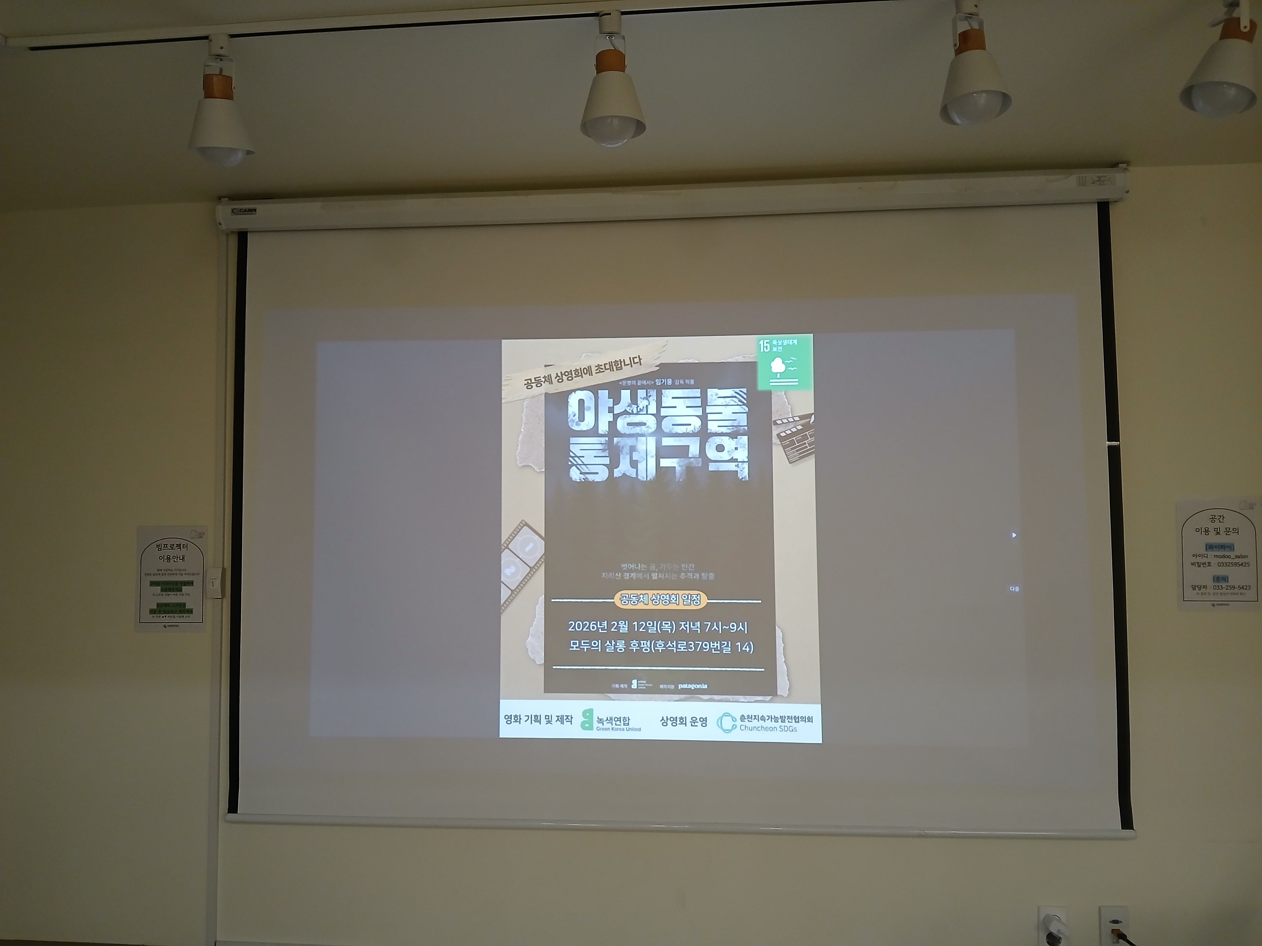 2026년 2월 12일 목요일 오후 7시, 모두의 살롱 후평에서 임기웅 감독의 다큐멘터리 ≪야생동물 통제구역≫를 관람했습니다.