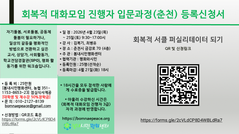 * 자격 요건 : 지역사회 갈등전환, 회복적 대화모임에 관심이 있는 성인